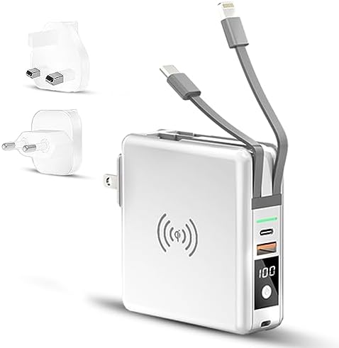 Pwr Travel – 5 in 1 Power Bank – Travel 5 in 1 Power Bank, Portable Charger with Ac Wall Plug & Built-in Cables, Built-in Type-C and Lighting USB Cable 4 Output and 2 Input (White)
